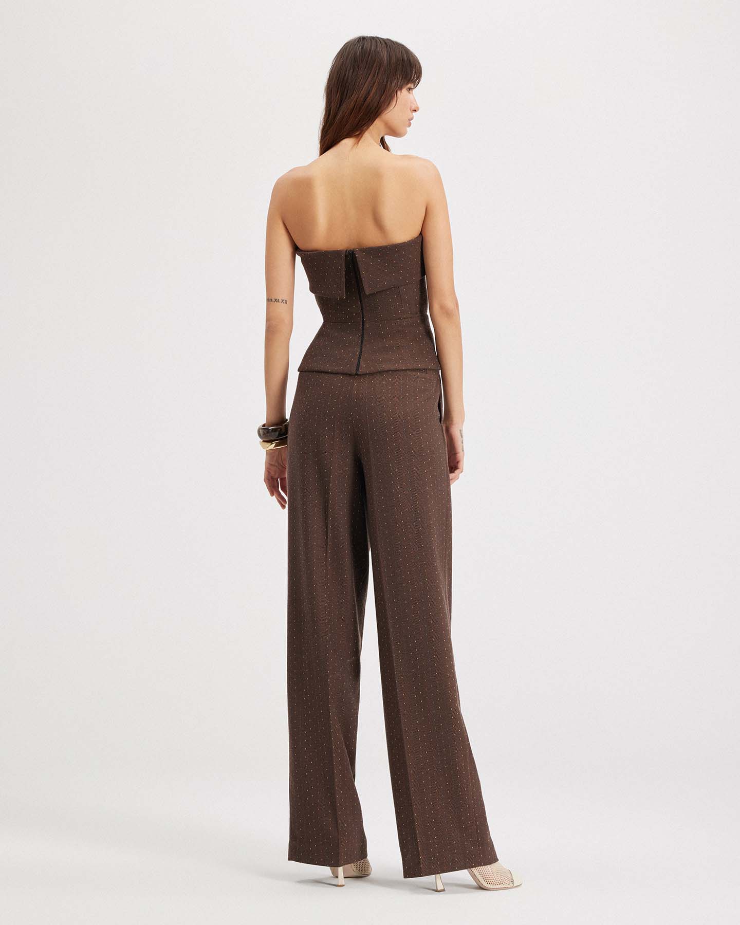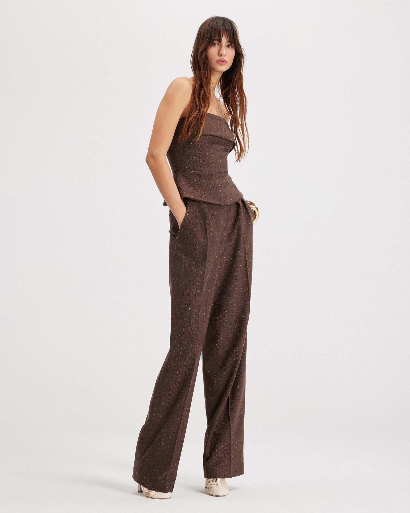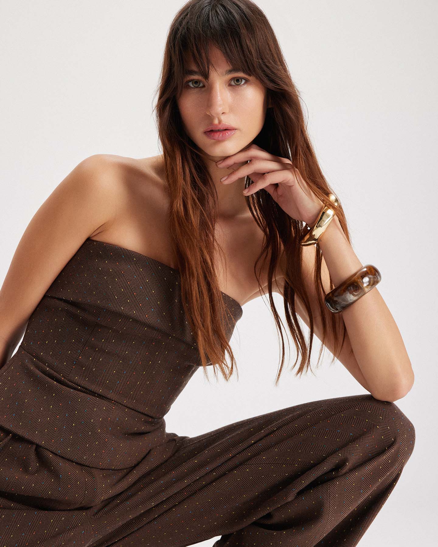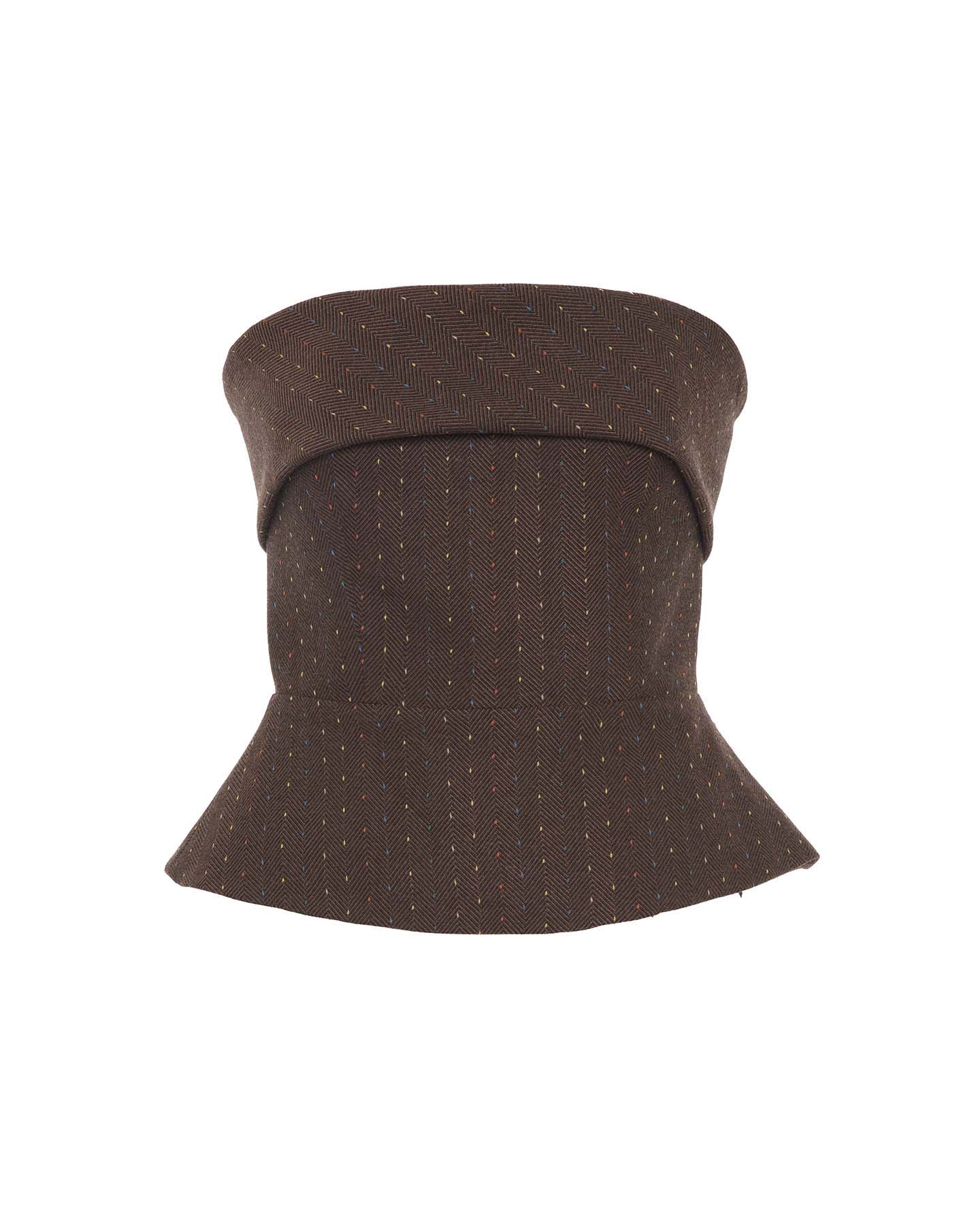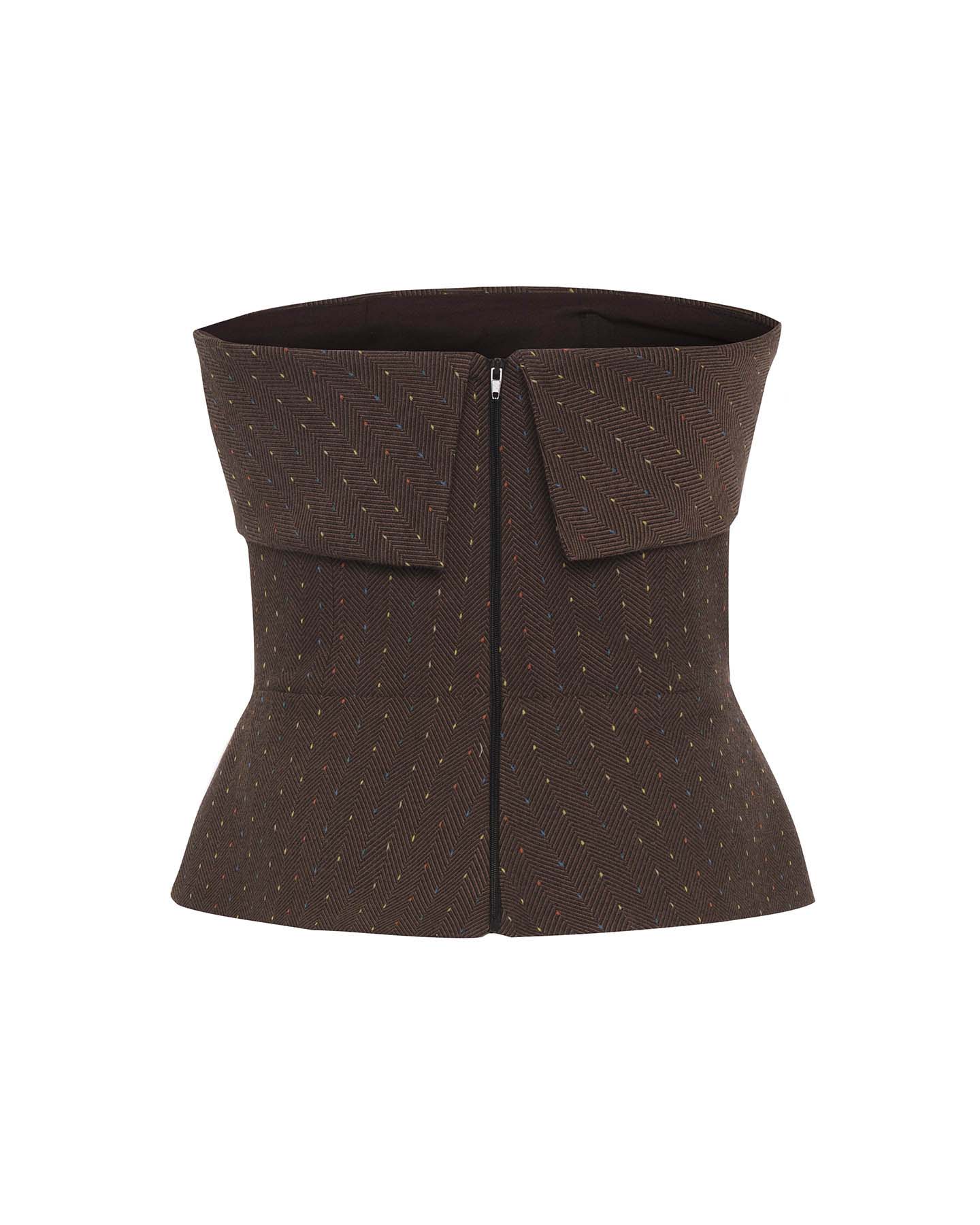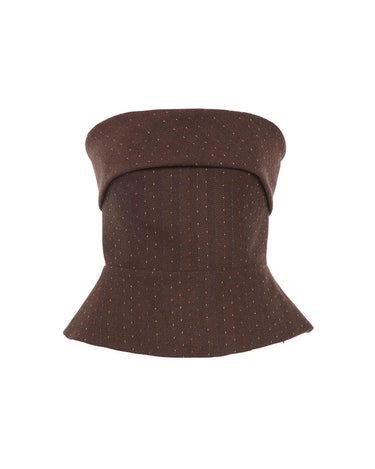 Romantic tailoring, redefined. The Kores Punto Herringbone Bustier Top offers a modern corset-inspired silhouette without the fuss. Cut from stretch punto with a jacquard herringbone pattern, it sculpts the torso with architectural ease, finished with a rolled-over neckline and fluted peplum hem for contrast and movement. Fine woven pin-dots in amber, lilac, and gold create a subtle plaid illusion, adding depth to the warm neutral hue. Feminine, polished, and quietly powerful.