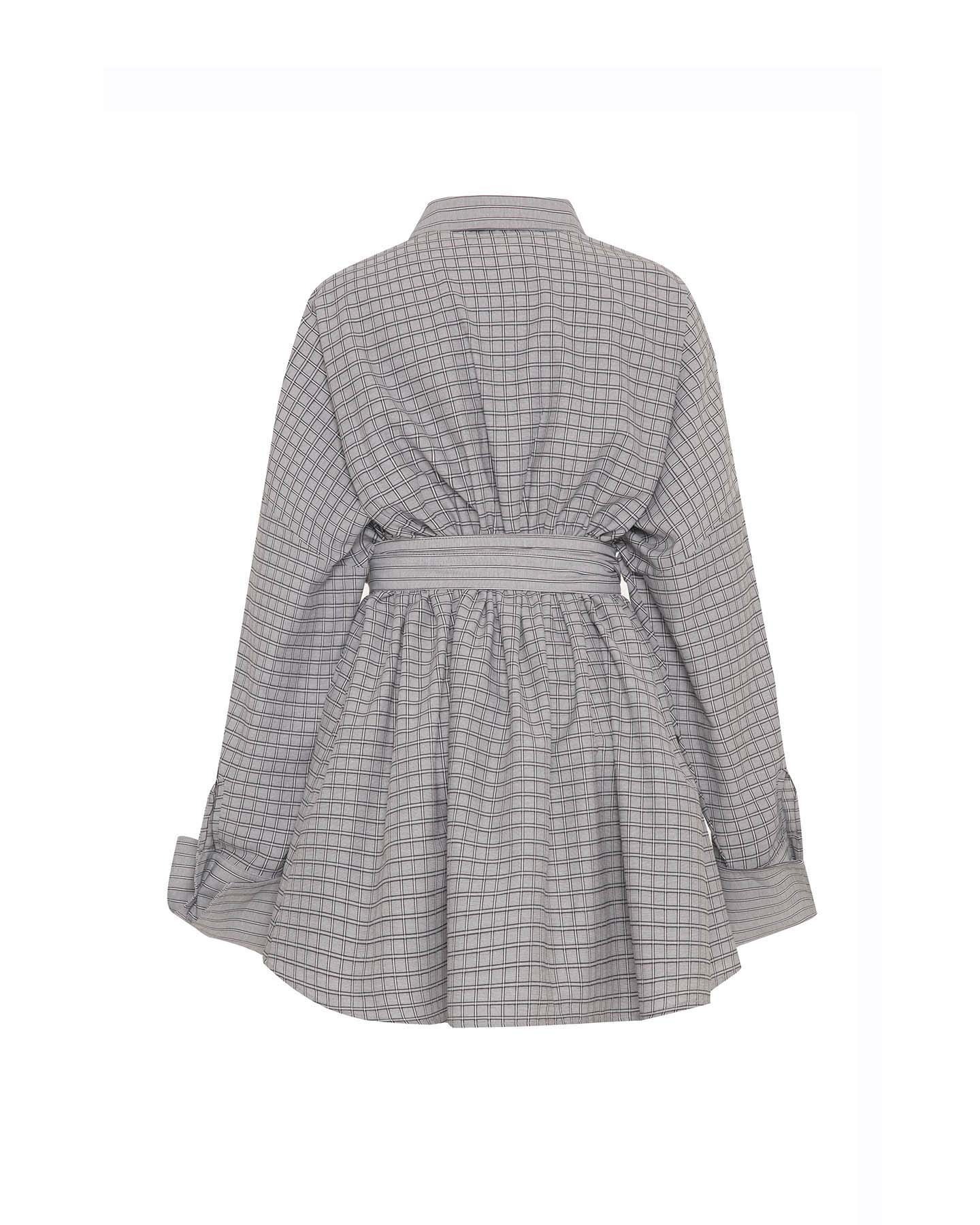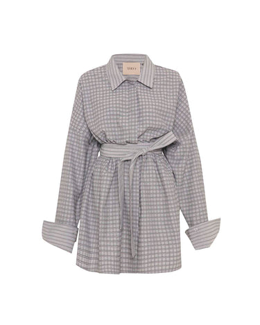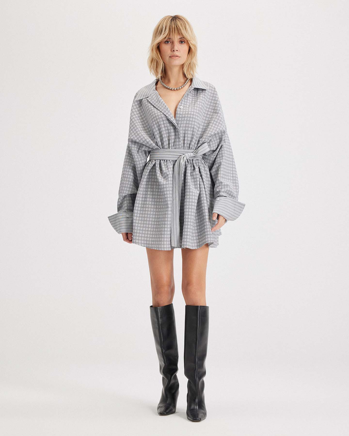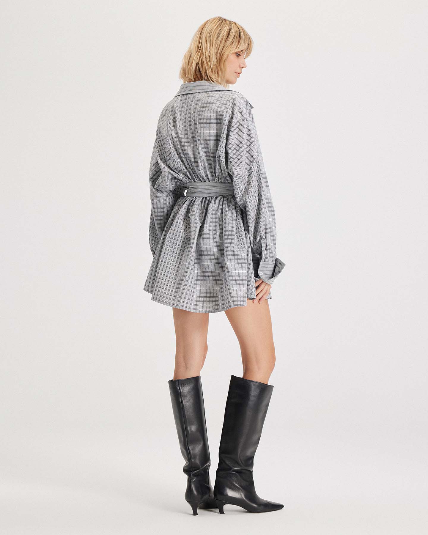 A fresh take on the classic shirtdress, the Echo Fit-and-Flare Mini blends menswear texture with a sculpted feminine shape. Cut from lightweight yarn-dyed stretch plaid with subtle sheen, it features a hidden front placket, soft flared skirt, and exaggerated sleeves that bring drama to the everyday. The wide self belt cinches the waist for definition, while hidden side zip pockets add function. Style it solo with boots or layered over slim pants for a modern twist.