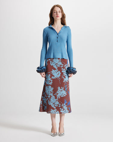 Designed with a straight cut and slight flare, this printed maxi skirt elongates the silhouette with tailored ease. The colorblock floral print makes a subtle statement, while the fluid fabric keeps it breathable. Pair with the coordinating cami or layer with knits and shirting for seasonal versatility.