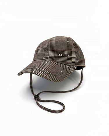 Tailored elegance meets subtle luminosity in the Eudora Petasos Messenger Cap. Crafted from a Prince of Wales check fabric threaded with delicate sequins, it offers a refined play of texture and light. With a curved brim, adjustable toggle cord, and polished metal logo, this piece brings understated glamour to modern utility.