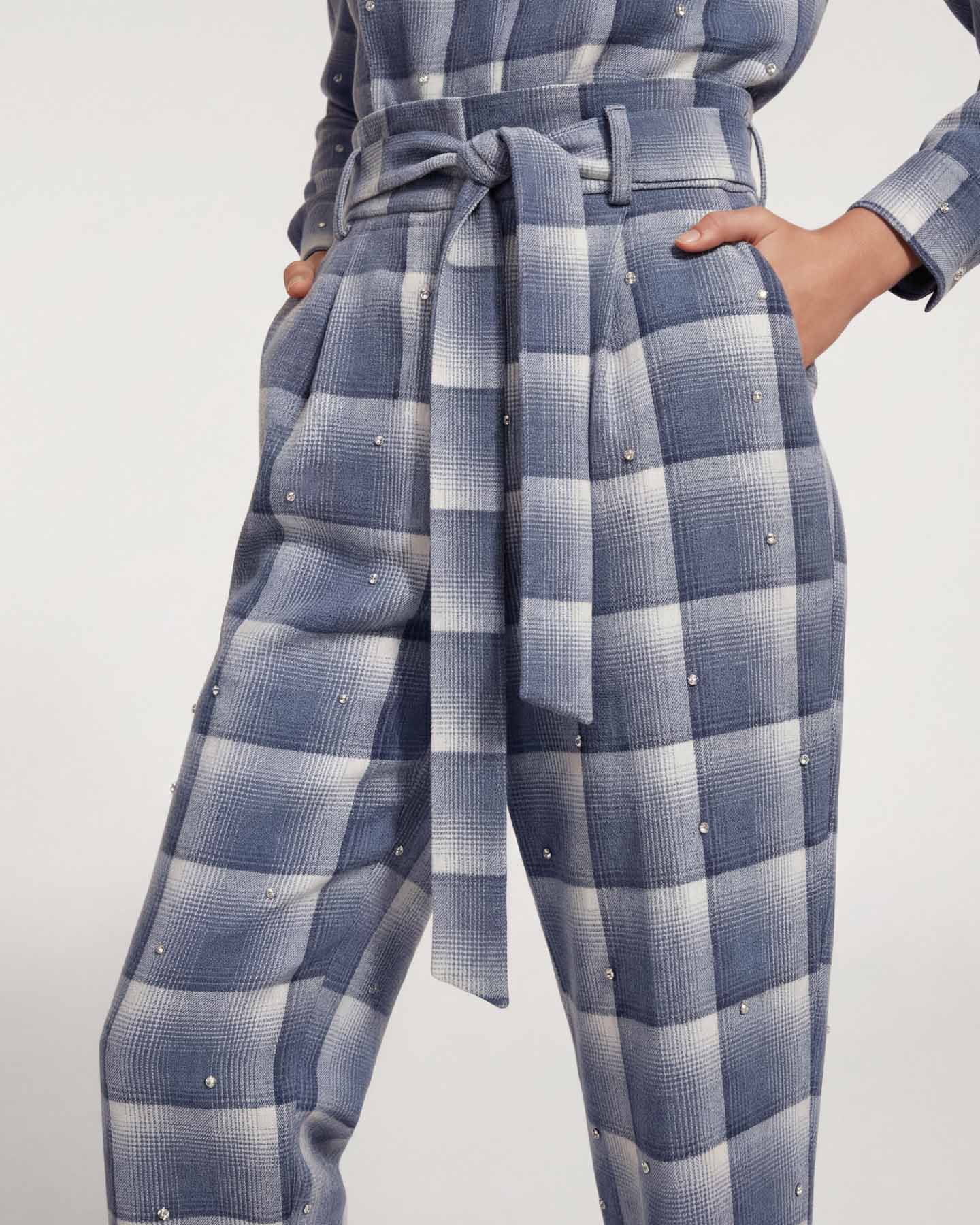 Where comfort meets quiet opulence, the Europa Plaid Flannel Crystal Pant blends soft flannel texture with tailored lines and luminous embellishment. Cut from brushed plaid cotton blend and detailed with hand-applied crystal studs, each glinting accent is secured with grommets for a durable, elevated finish. The straight-leg silhouette features a flat front and elasticated back waist for easy wear, while a soft self belt adds styling versatility. Pair with the matching shirt for a head-to-toe moment or mix with structured shirting for modern contrast.