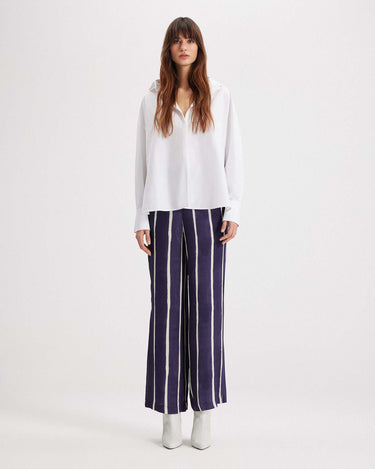 Equal parts ease and elevation, the Selena Stripe Wide Leg Pant is designed to move with you. Made from a silky bamboo viscose blend, the hand-painted vertical stripe elongates the frame while the wide-leg cut creates graceful flow. The flat front and hidden side zip offer a clean, polished look, while the elastic back waistband keeps things comfortable. Pair with crisp shirting or casual tanks for a fresh take on relaxed tailoring.