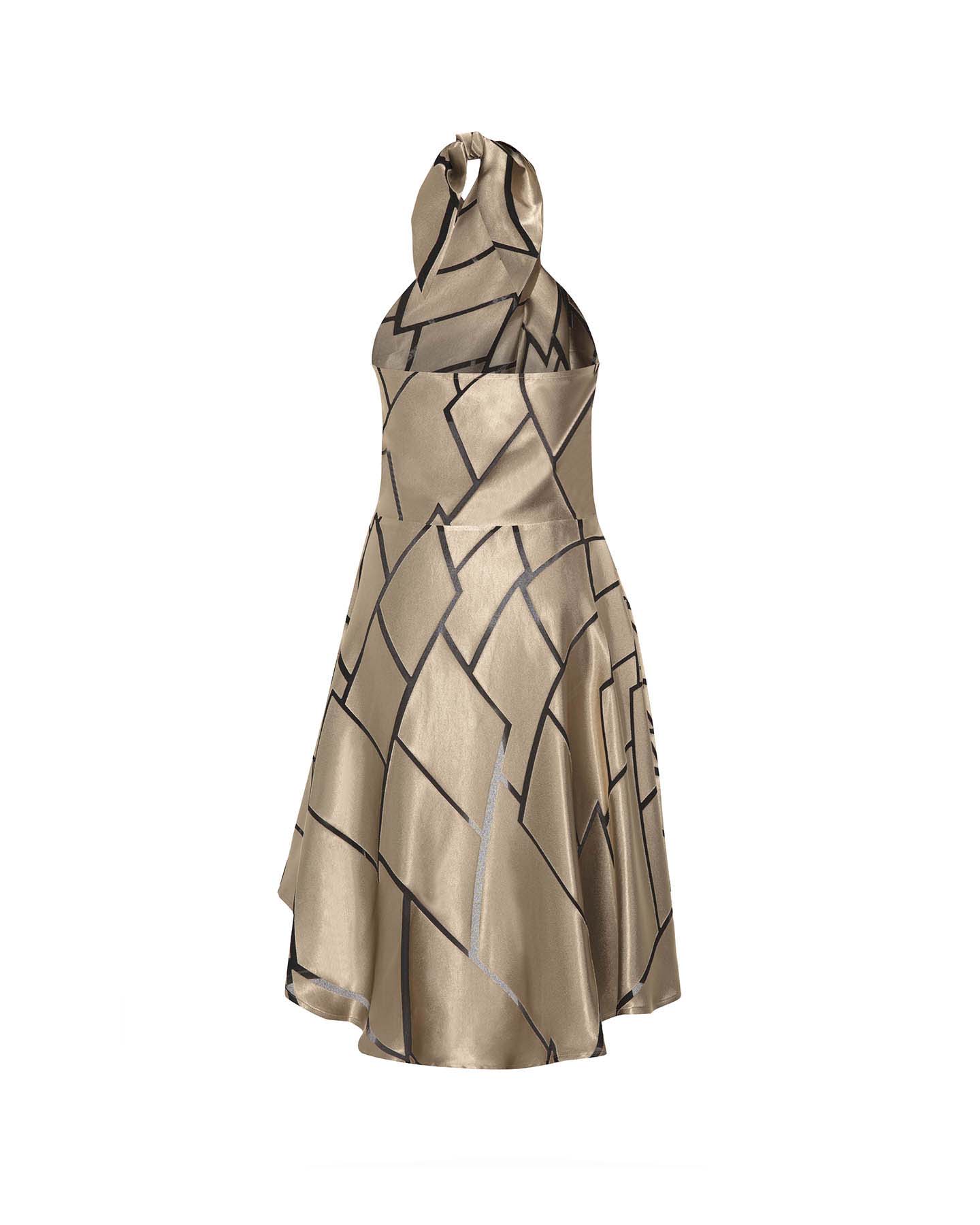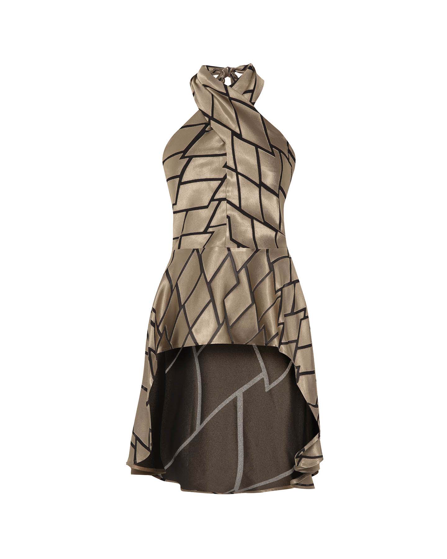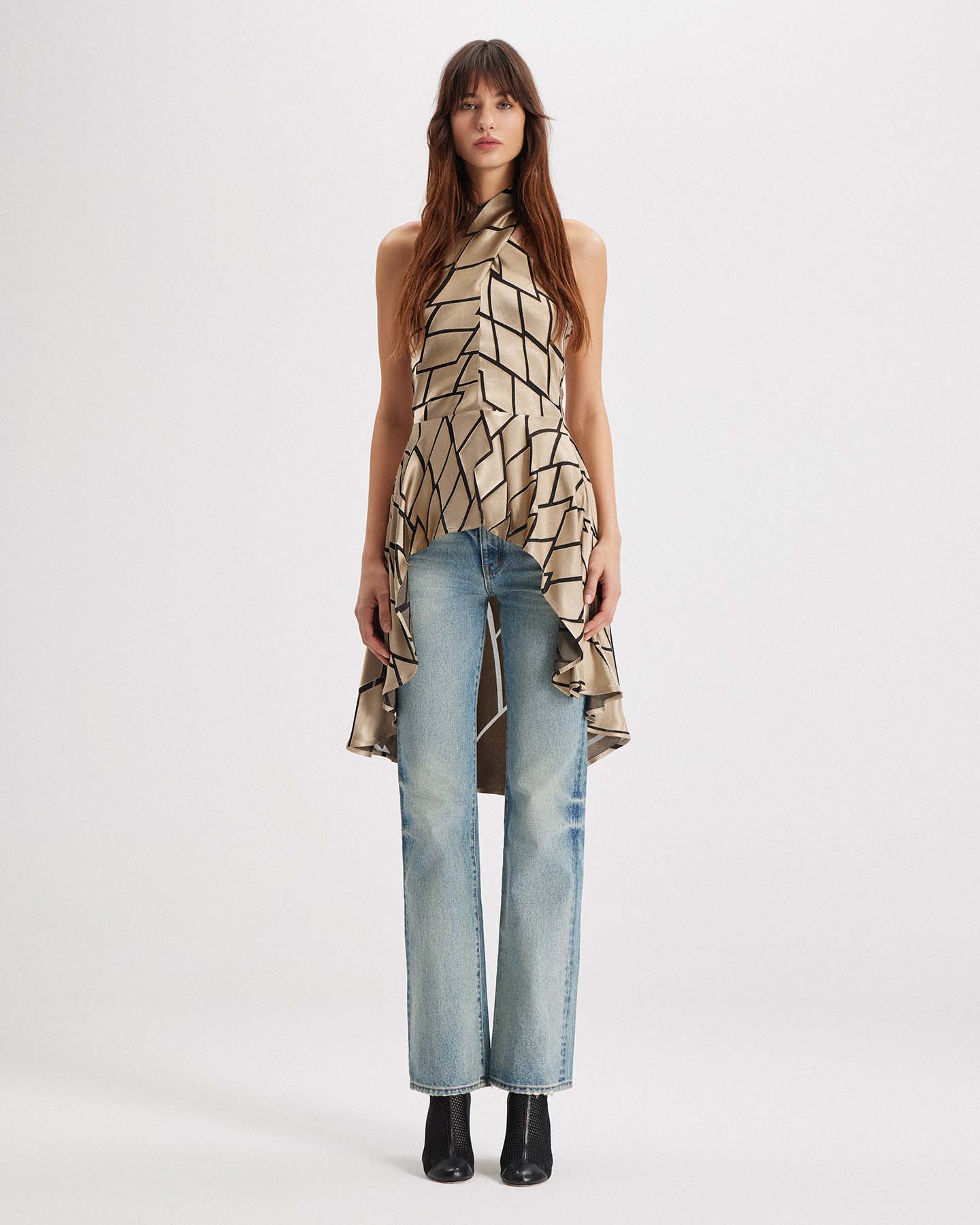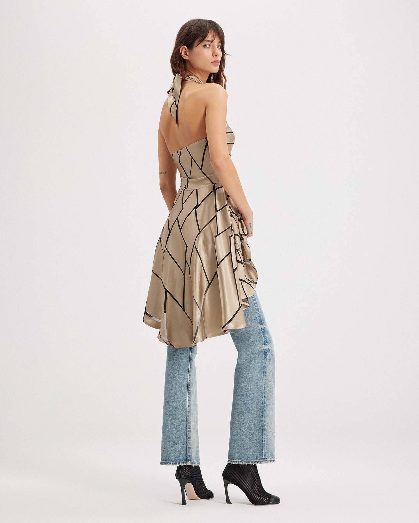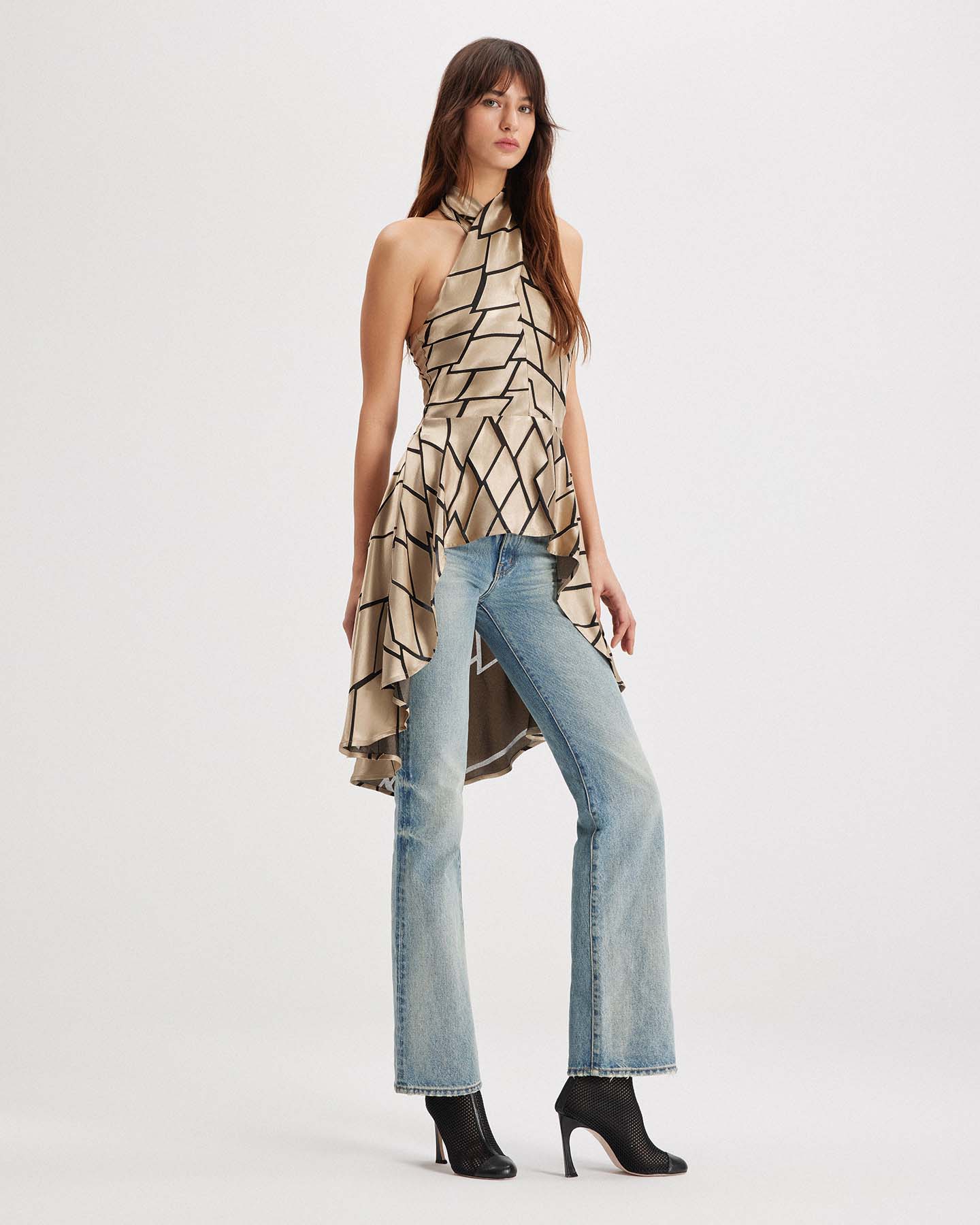 Striking from every angle, the Theia Retro Burnout Hi-Low Halter Top is an architectural take on statement eveningwear. Made from luxurious burnout satin with glossy abstract patterning over a sheer matte base, it features a sculpted halter neckline that ties at the back and a defined waist that flares into a dramatic asymmetric hem. The backless silhouette brings bold energy, while the fit-and-flare cut ensures feminine flow. Pair it with denim, wide-leg trousers, or the matching skirt for a look that commands attention.