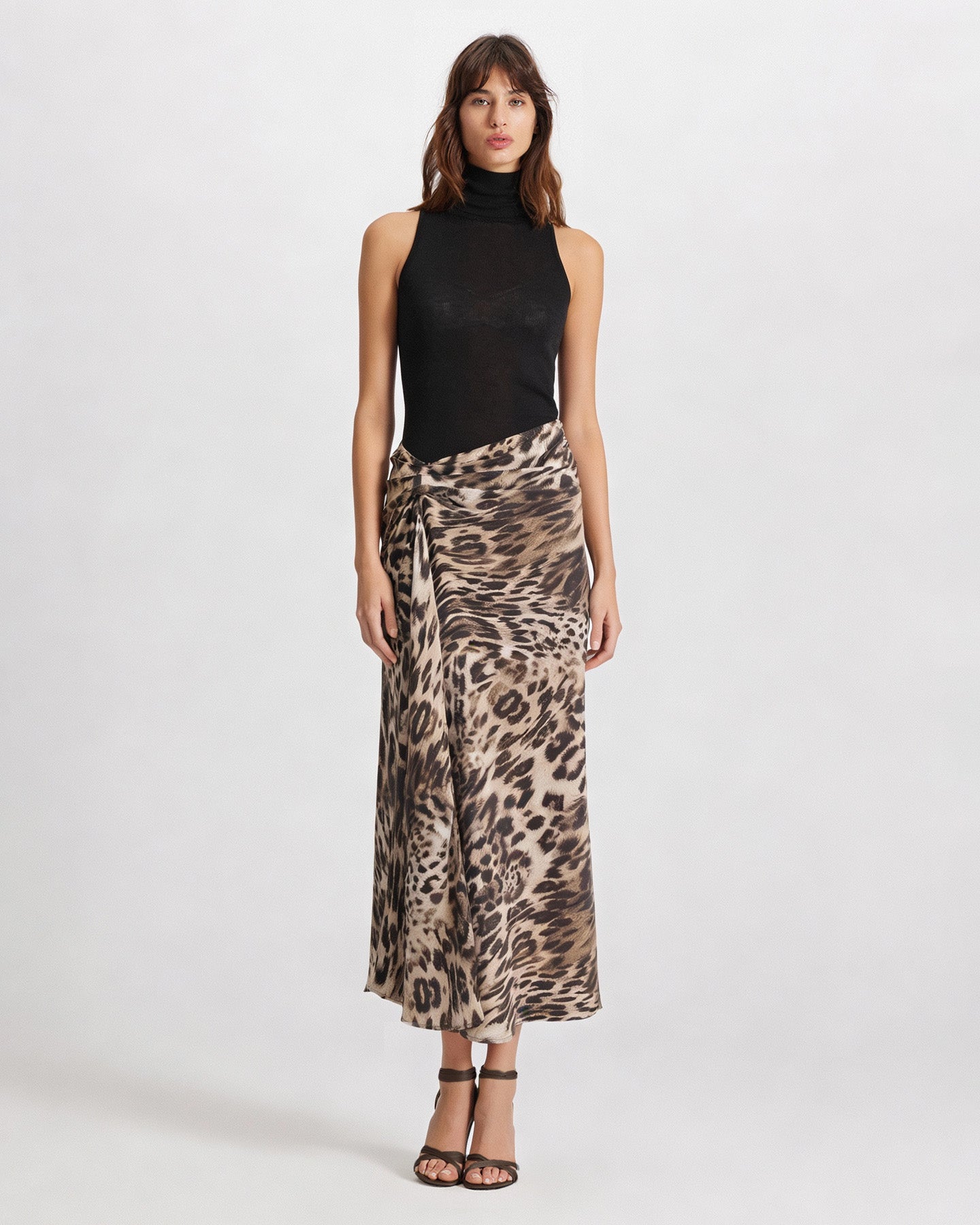 Soft and fluid, this pull-on skirt in all-over leopard print features side ruching and an asymmetric hem for graceful movement. Made from sustainable silk-touch fabric, itÕs as comfortable as it is bold. Pair with the matching henley shirt or a crisp blouse for striking coordination.