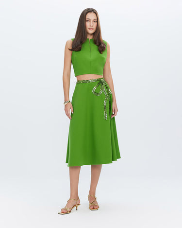 Step into the spotlight with the Harmonia Embroidered A-Line Skirt in the season’s must-have Rewild green color. Hand-embellished with intricate bow sequins and shimmering beaded trim, this A-line skirt is a true showstopper. Pair it with the matching jacket or top for a striking monochromatic look, or style it with a simple shirt for effortless elegance.