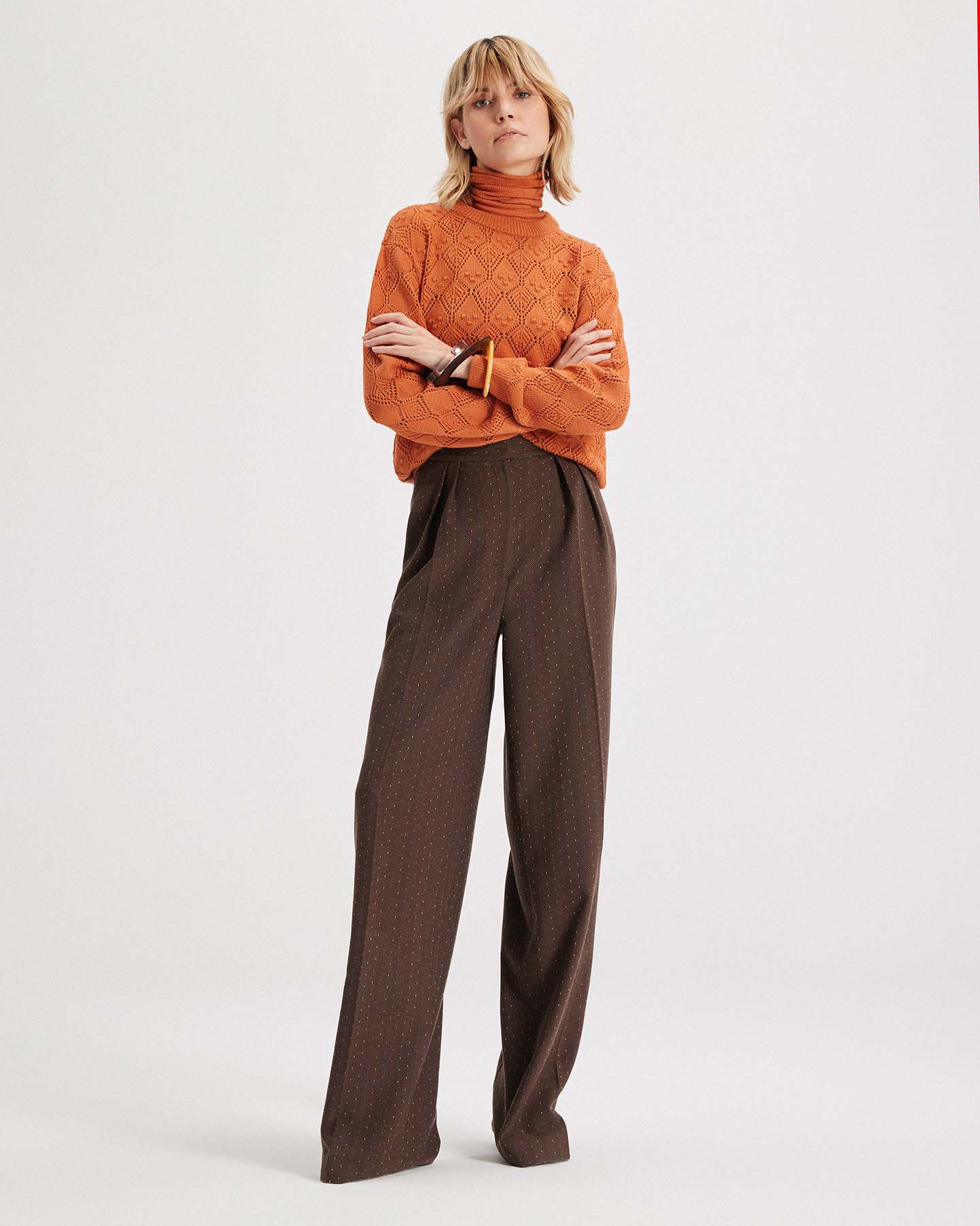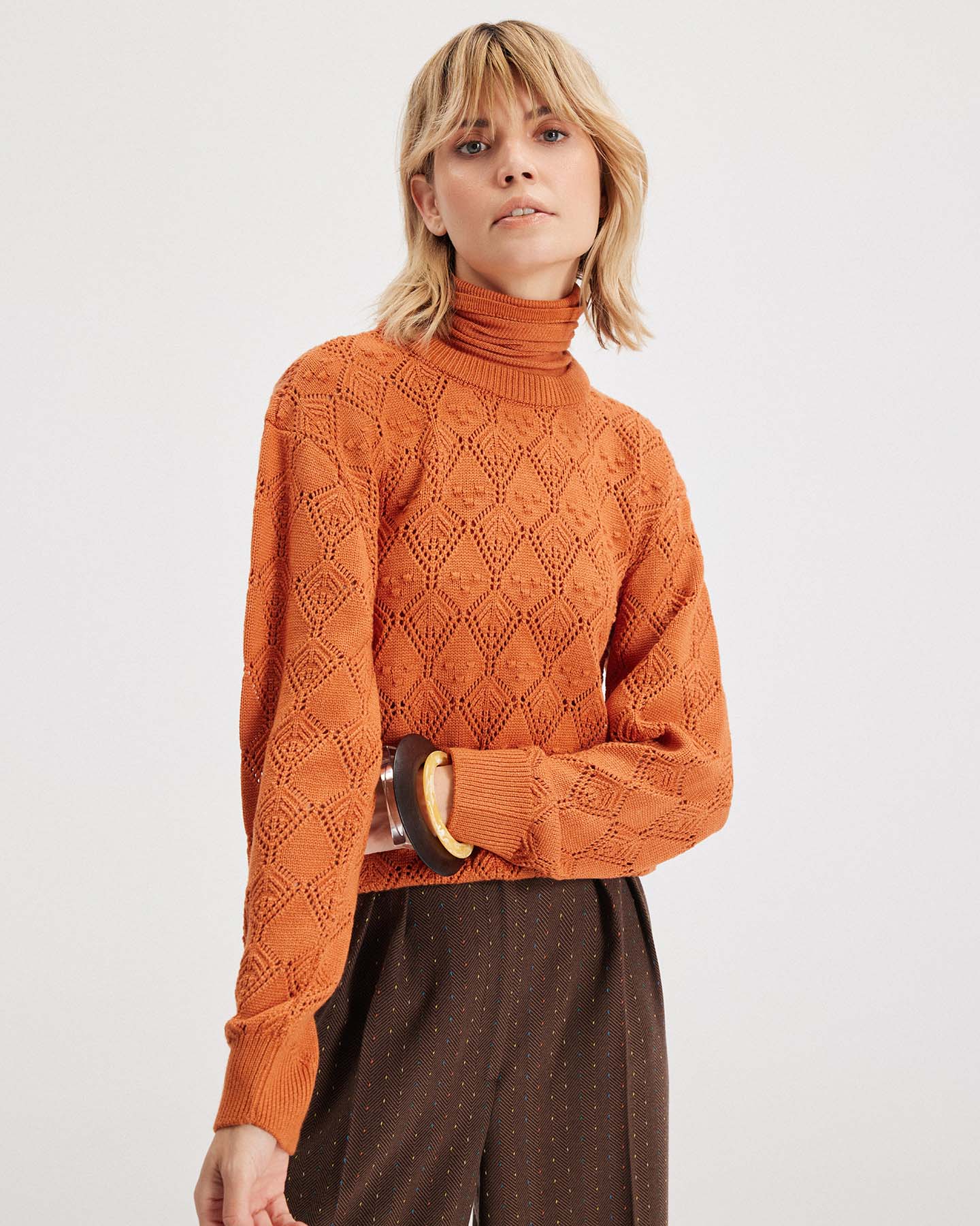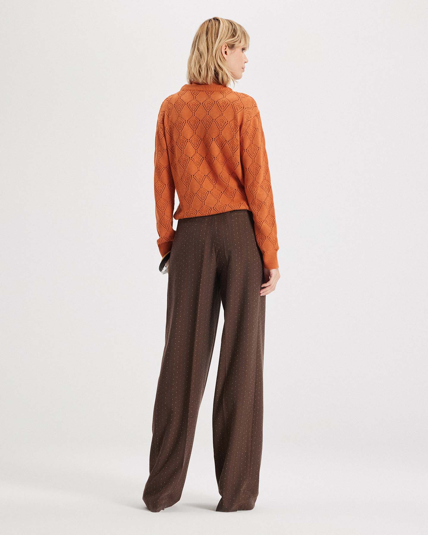 An essential with elevated texture, the Ersa Pointelle Argyle Pullover is THEO's take on a modern heirloom knit. Crafted from a lightweight fine-gauge yarn, it features a custom-developed pointelle argyle stitch that nods to tradition while staying firmly in the now. The silhouette is clean and effortless, with a ribbed crew neck and straight body for easy styling. Available in warm amber or soft mauve tones, Ersa is perfect layered over tailoring, paired with trousers, or worn alone to reveal subtle skin through the open knit.