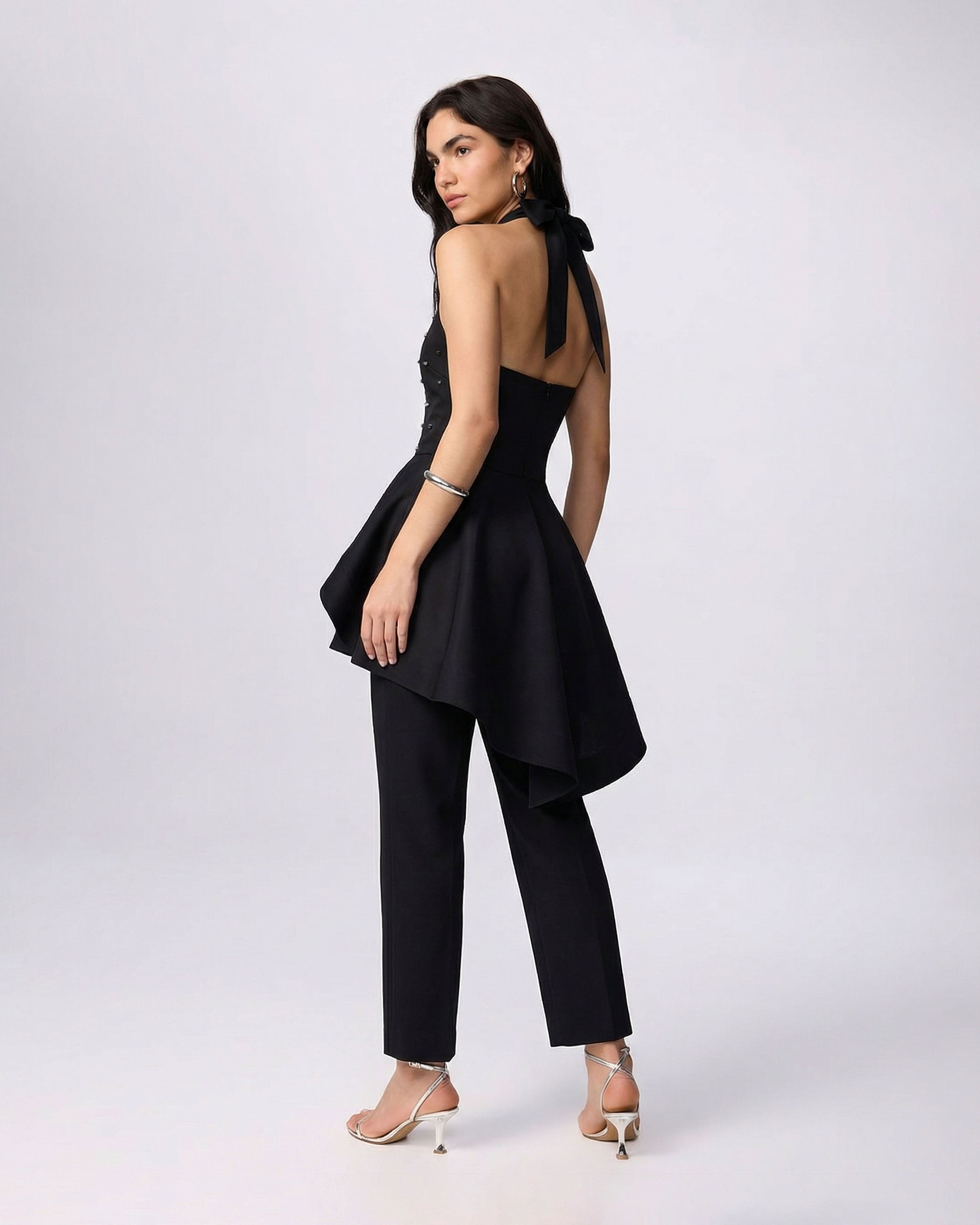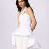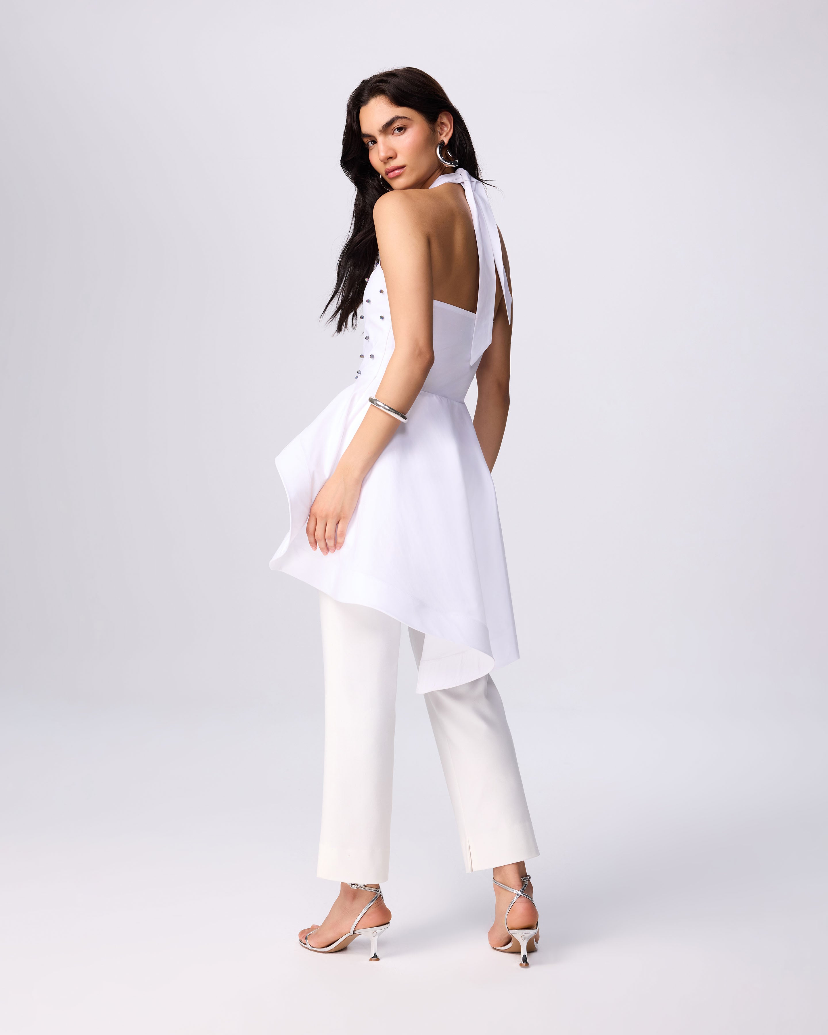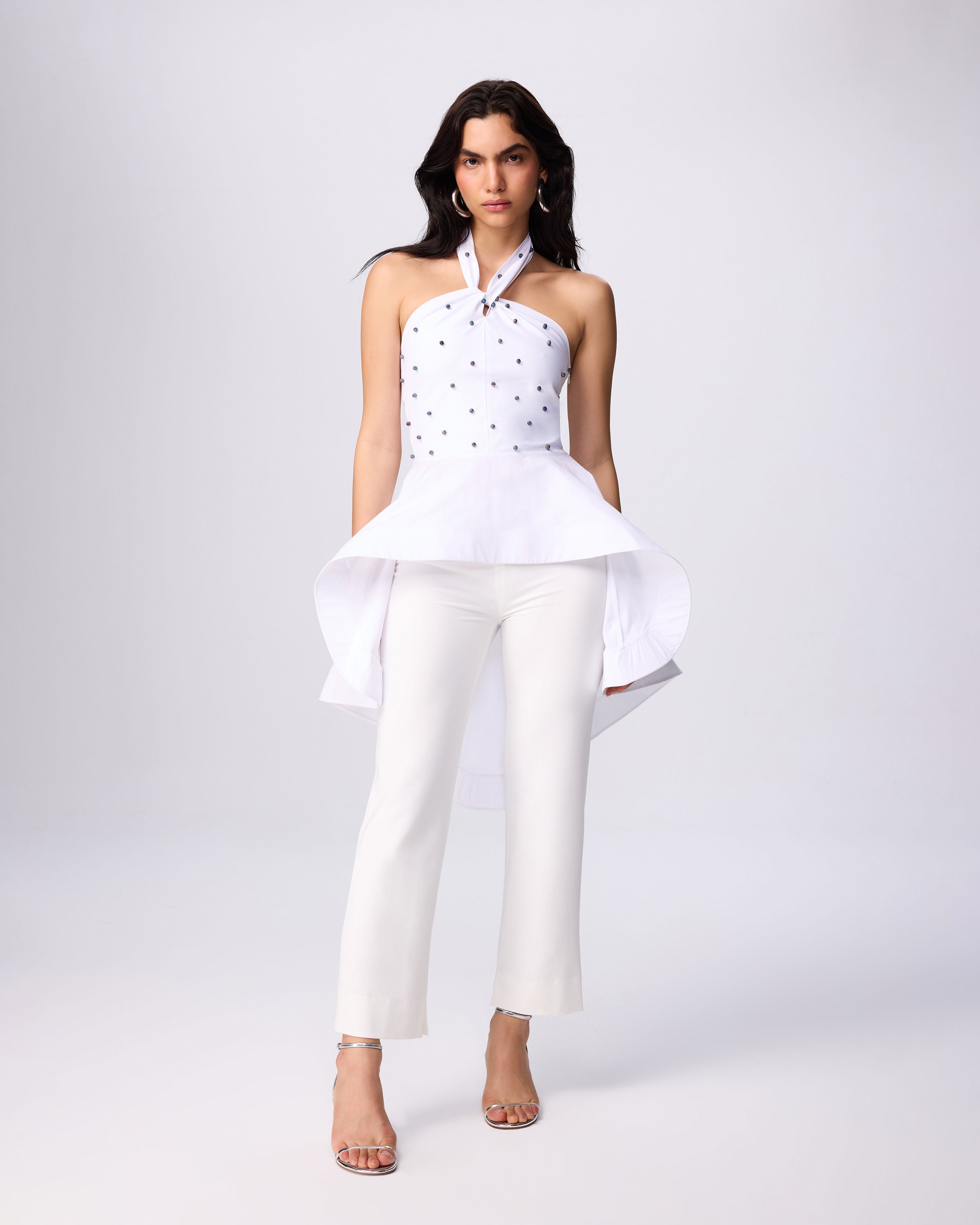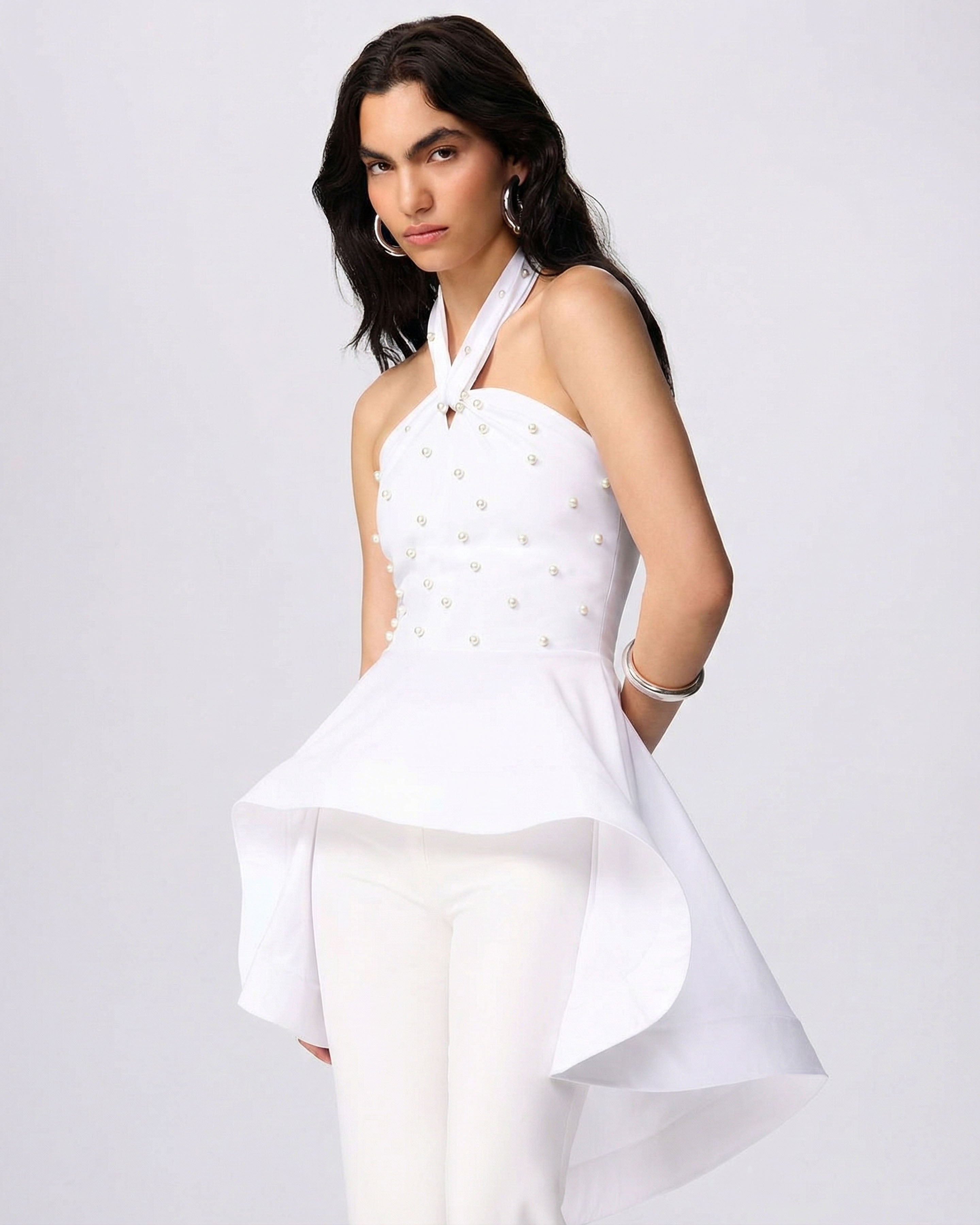 The Echo Hi-Low Pearly Halter Top is a statement blouse designed with a halter neckline and a sculptural hi-low hemline. Pearl embellishment is applied throughout, adding subtle texture and light-catching detail.
