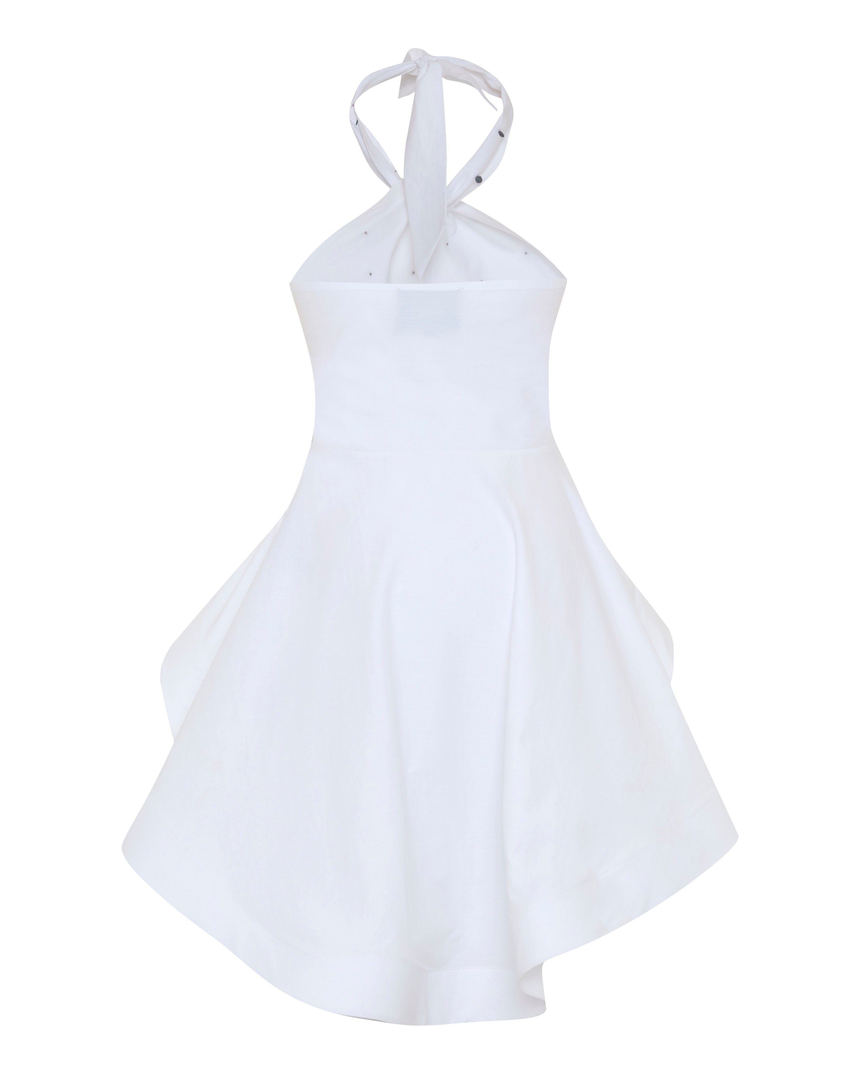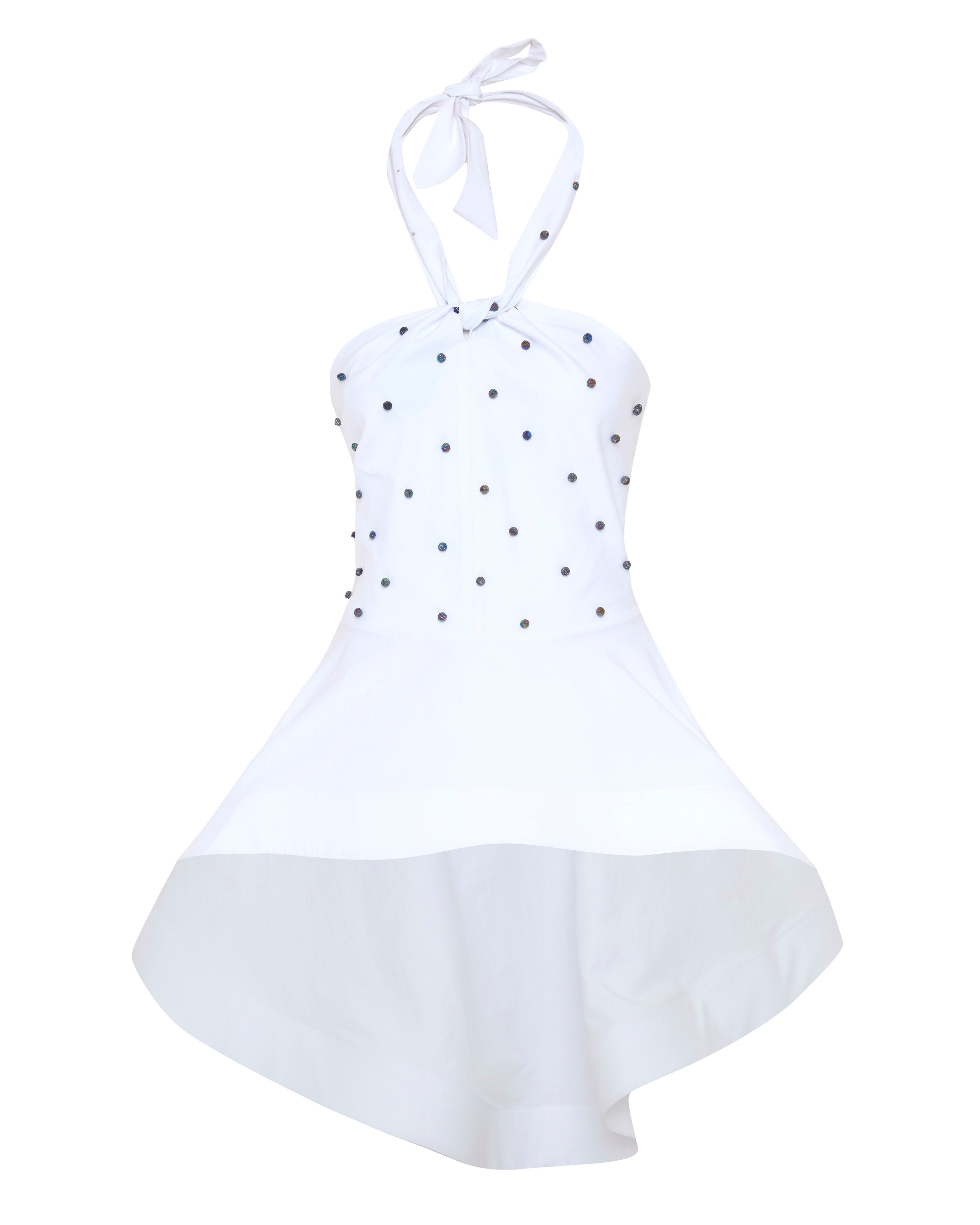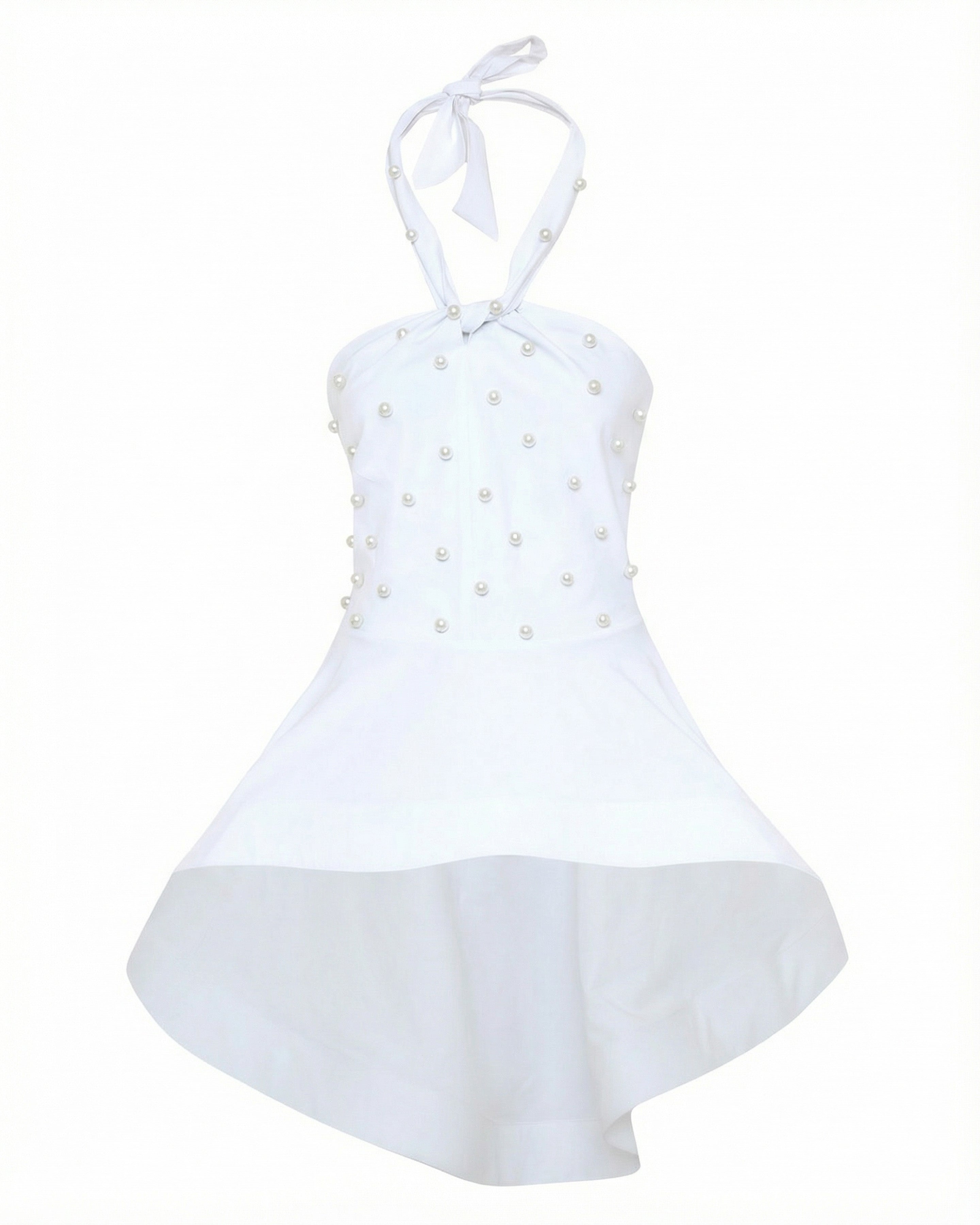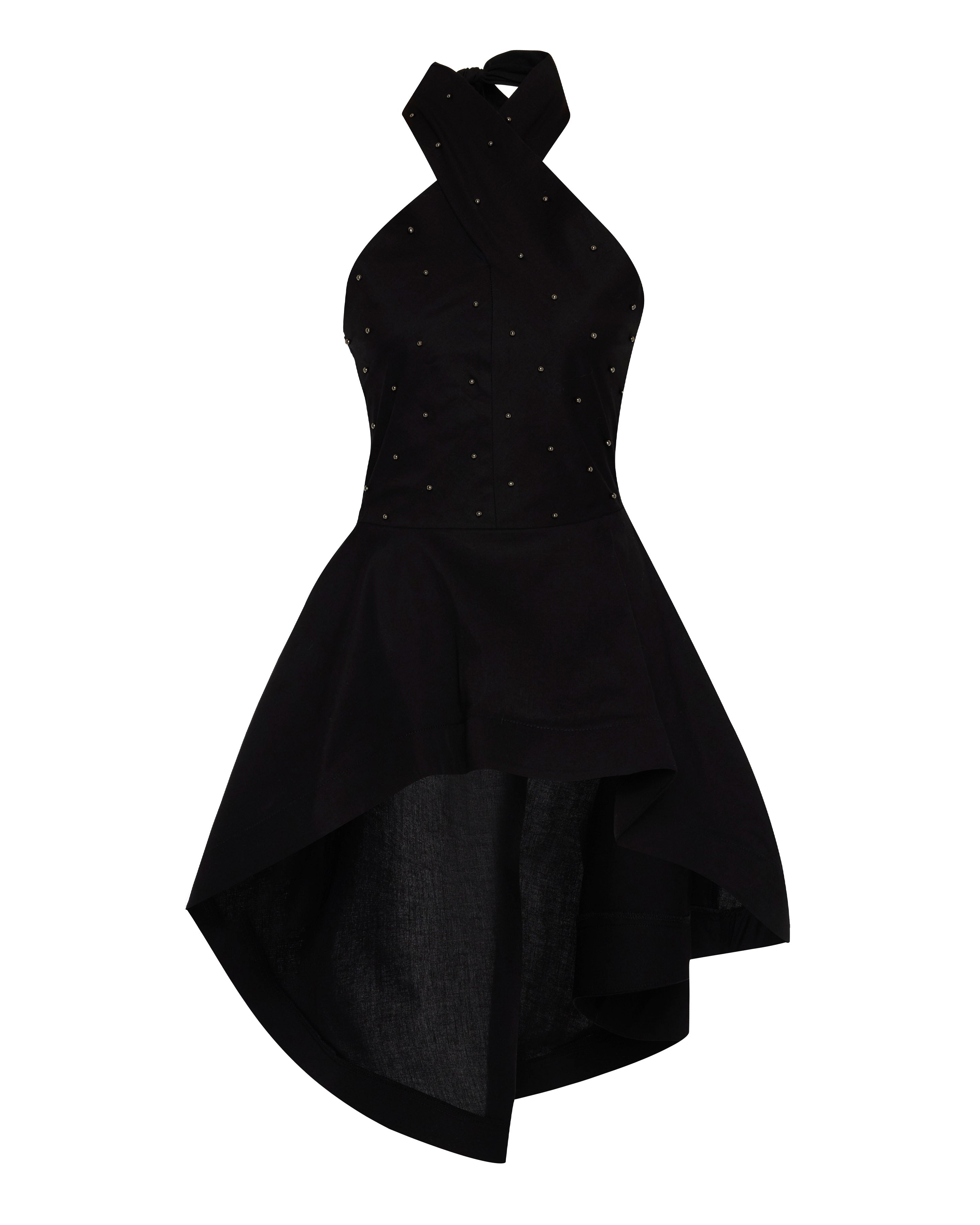 The Echo Hi-Low Pearly Halter Top is a statement blouse designed with a halter neckline and a sculptural hi-low hemline. Pearl embellishment is applied throughout, adding subtle texture and light-catching detail.