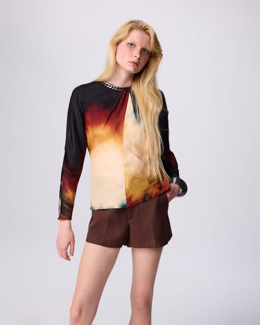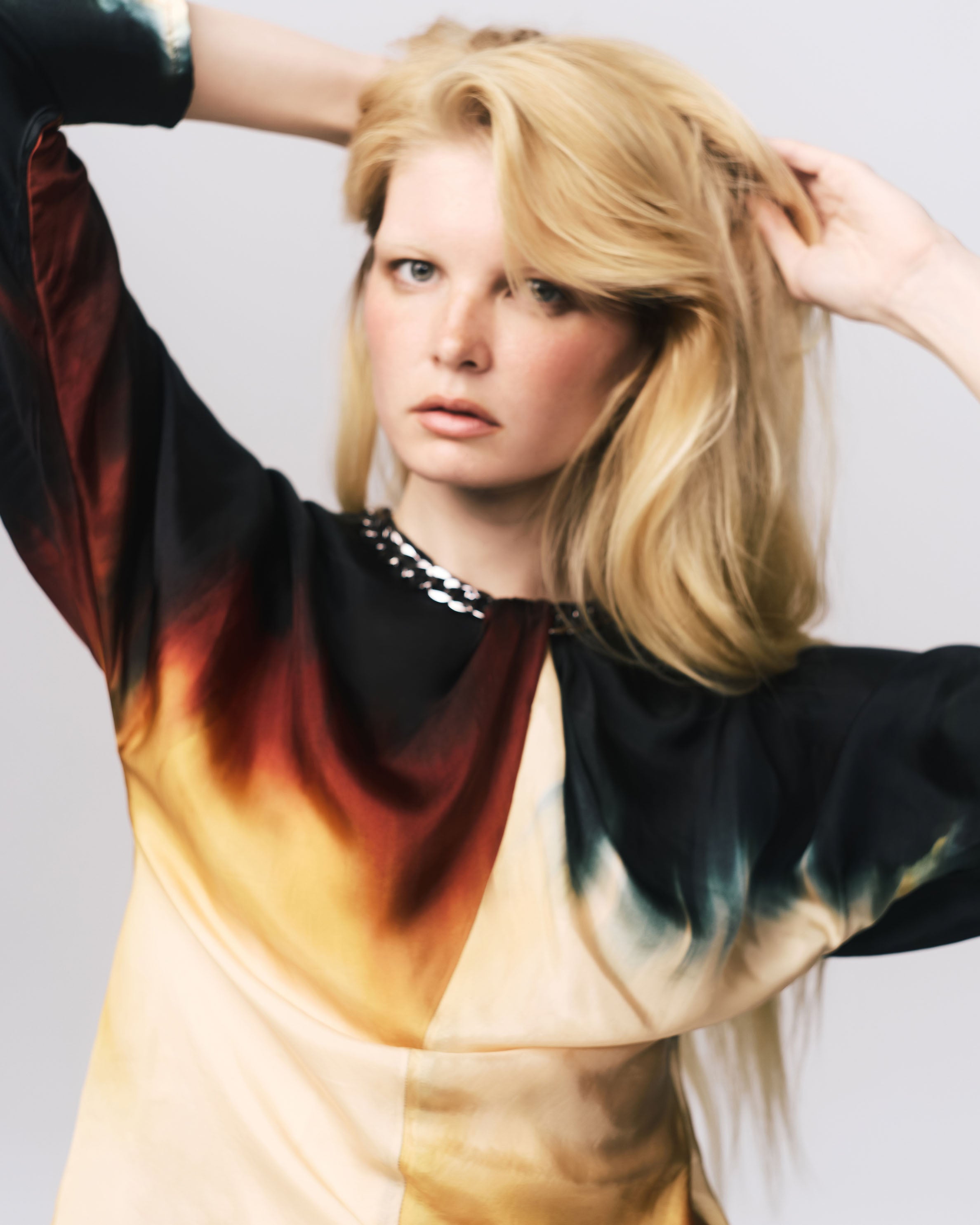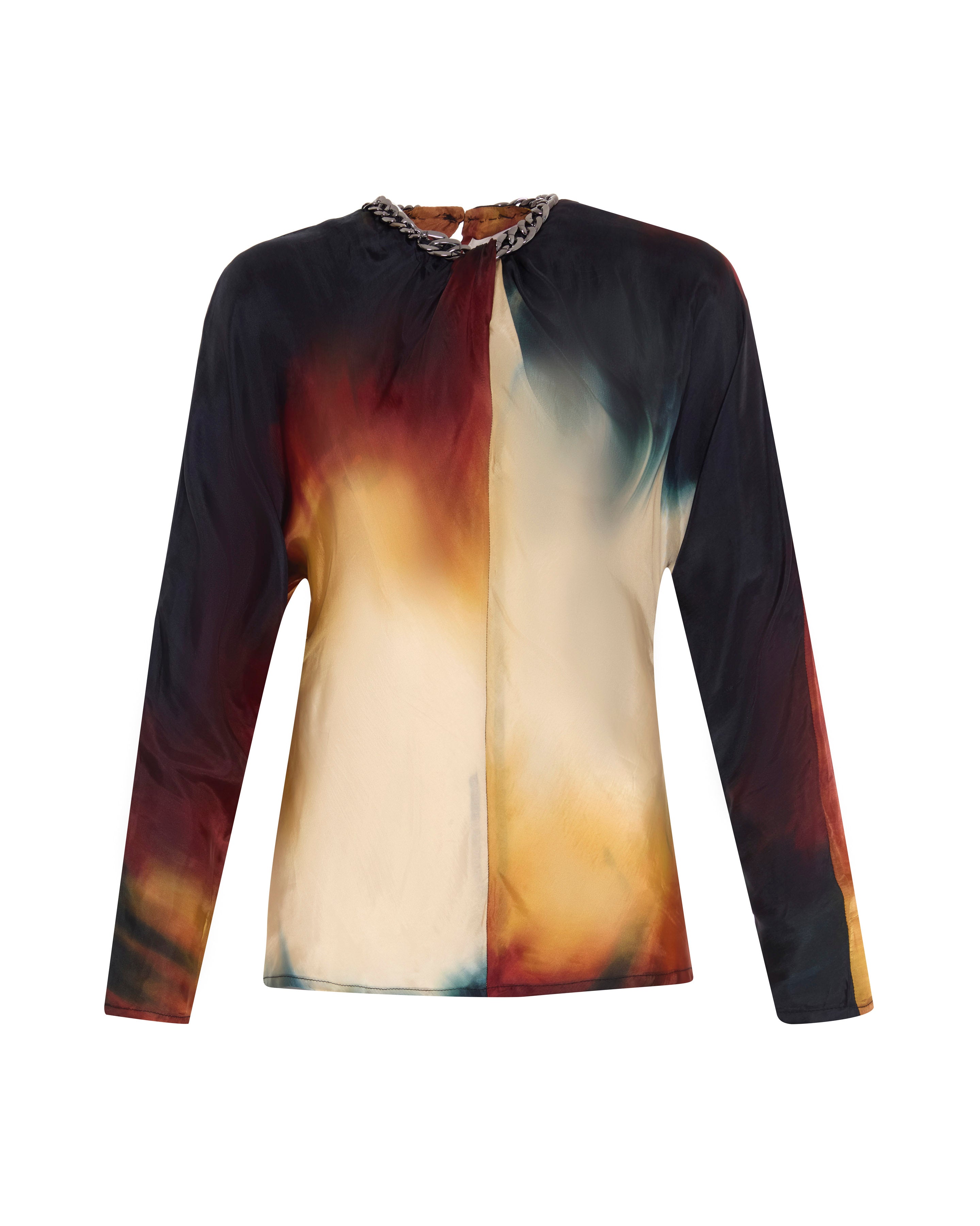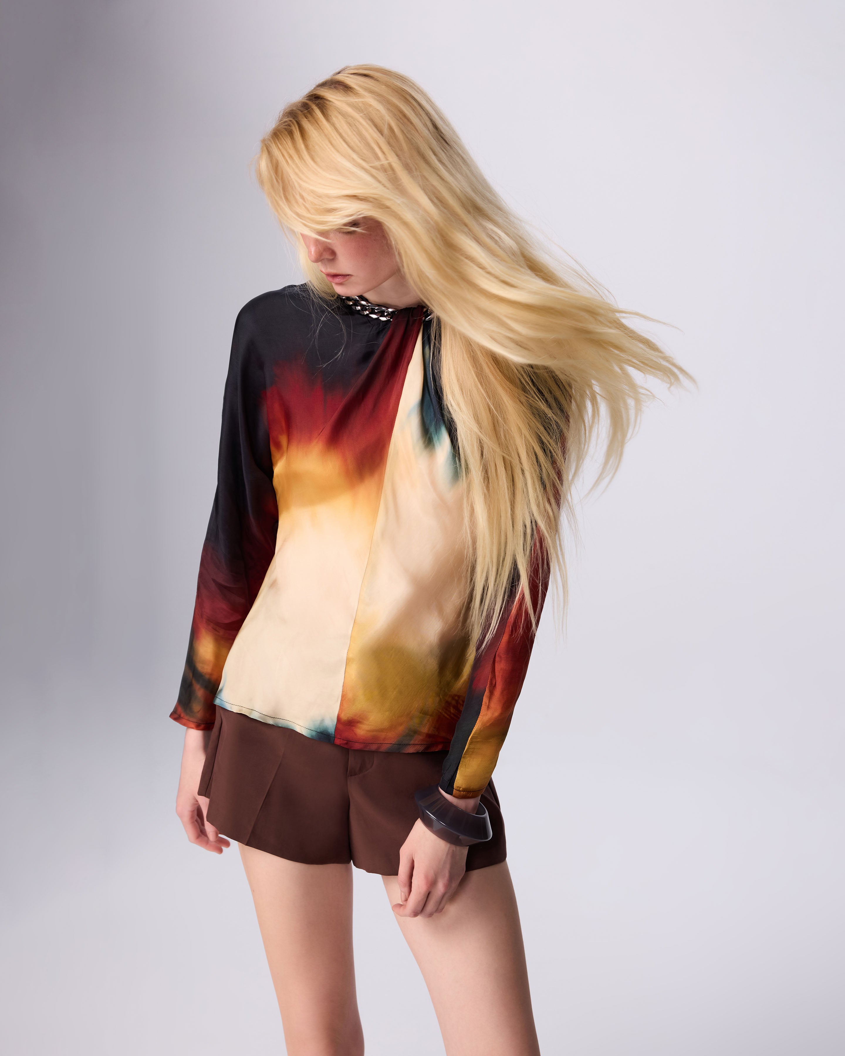 Crafted in a lightweight cupro-viscose blend, it offers a smooth, silk-like feel with a subtle sheen. Designed to pair effortlessly with tailored trousers or skirts, it brings a polished yet expressive element to both day and evening looks.