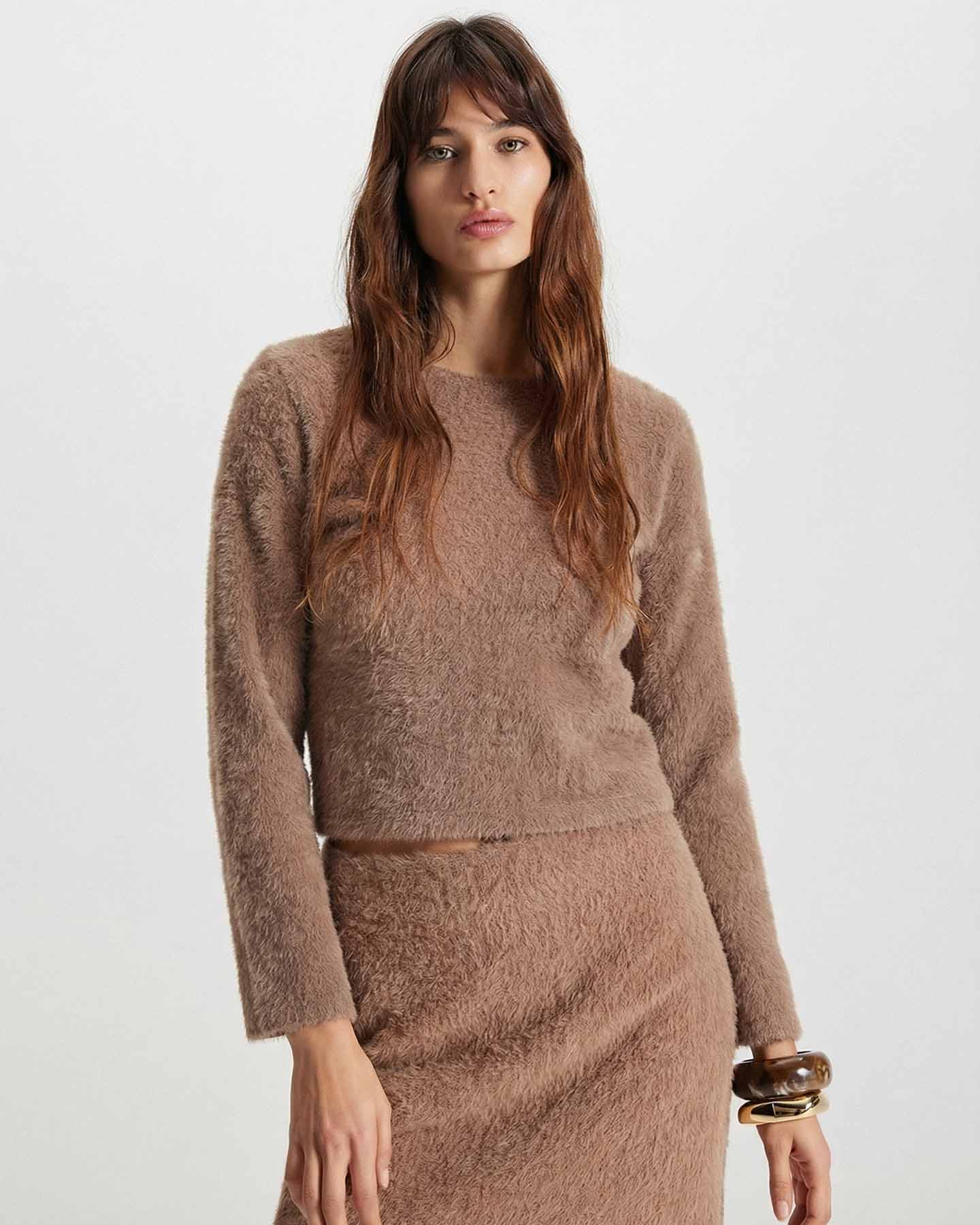 Soft to the touch with a textured lace knit, this plush long-sleeve top features gentle bell sleeves and a clean boat neckline. Its cozy teddy-like feel offers an elevated alternative to everyday knitwear. Wear with matching Carme pieces or pair with denim for casual charm.