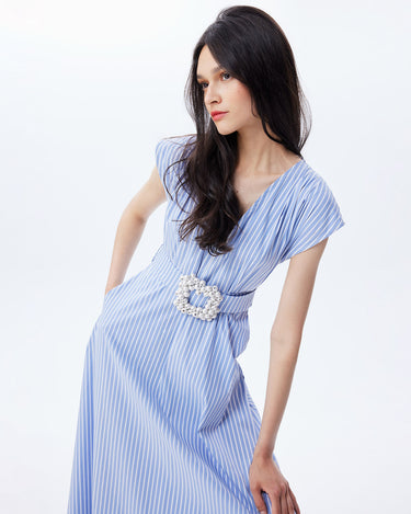 The Echo Beaded Belt V-neck Shirtdress combines functionality with embellishment. Crafted from ultra-soft striped cotton stretch fabric, it features a hand-embellished pearl belt, side pockets, and a flattering drop shoulder design. Perfect for dressing up or down.