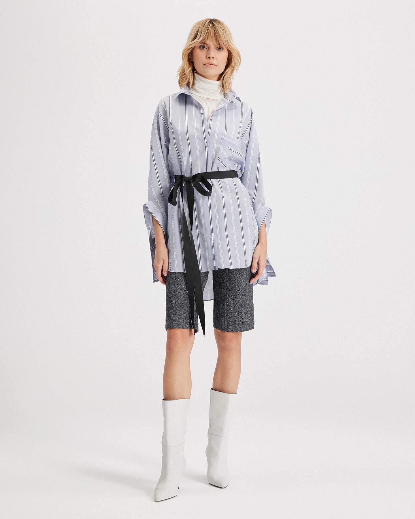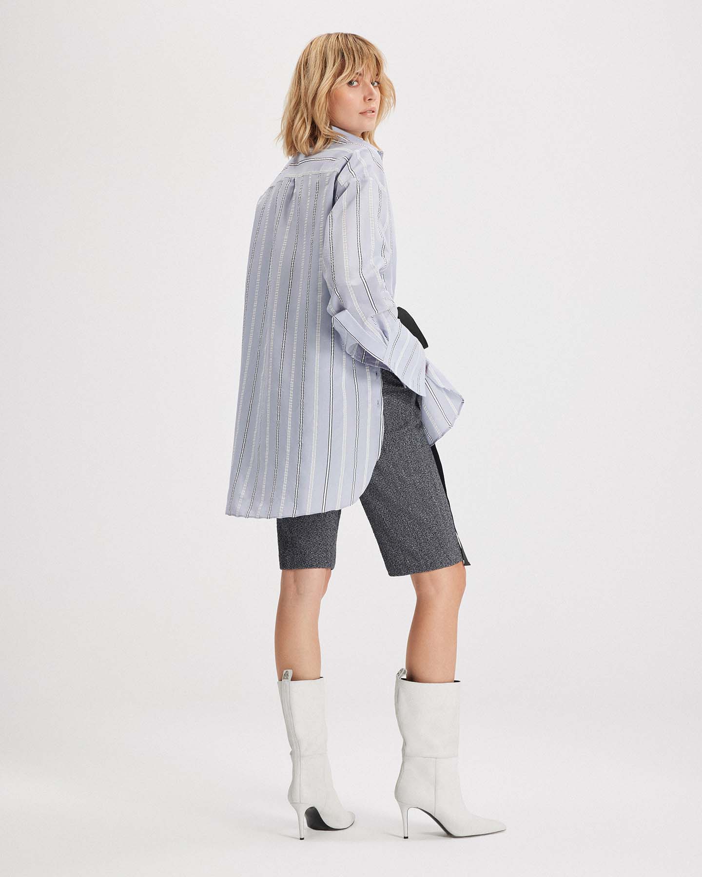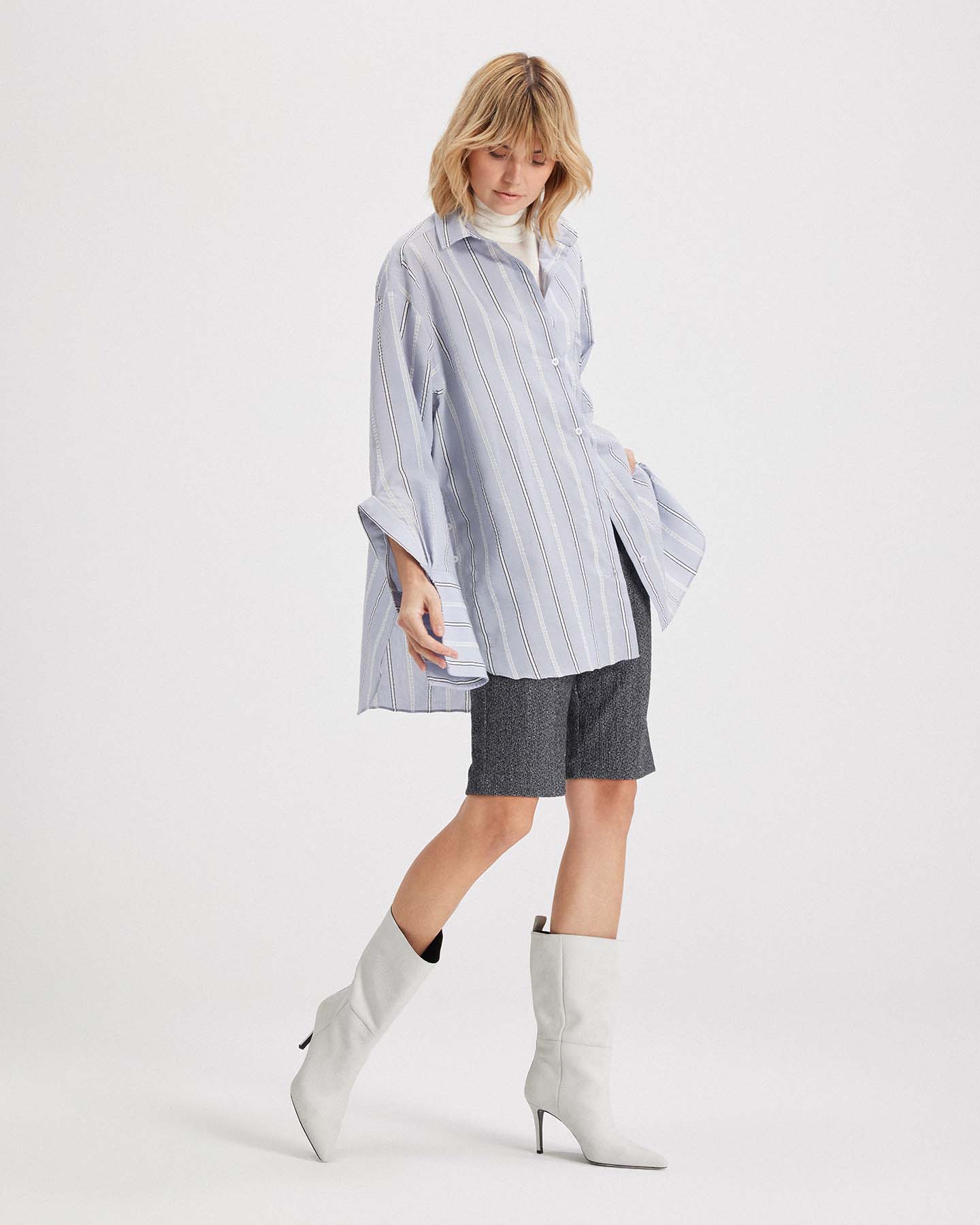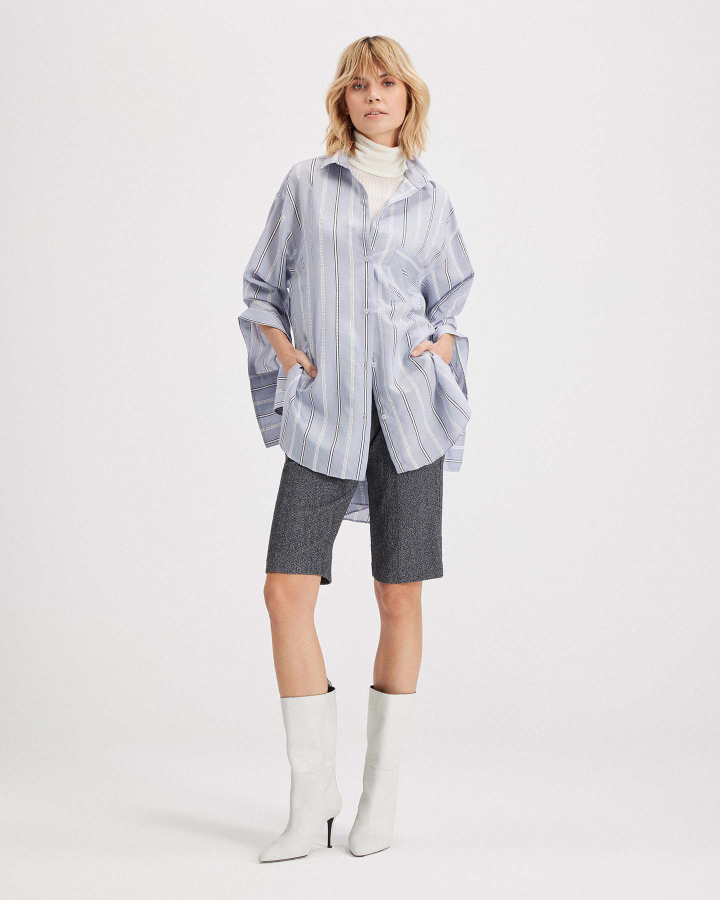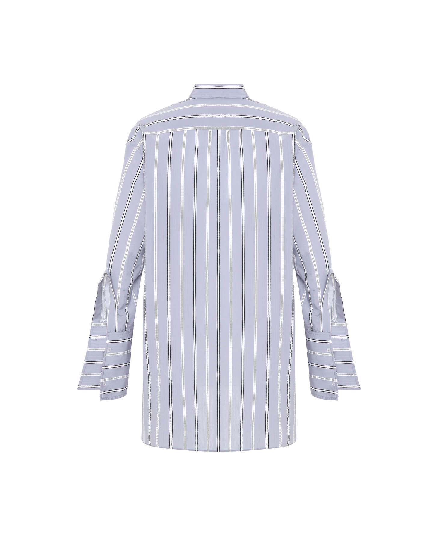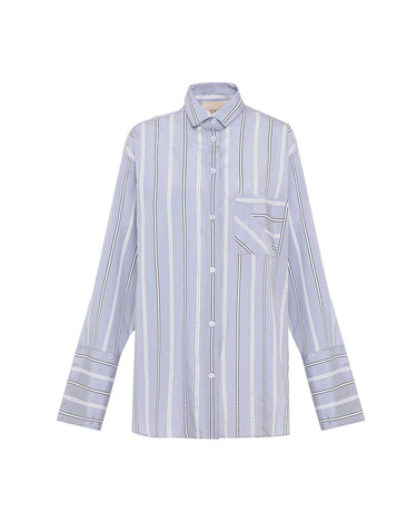 The Euanthe Side Button Boyfriend Shirt offers a modern twist on a menswear staple. Crafted from luxe textured stripe jacquard, it features an oversized silhouette with directional details, like a diagonal chest pocket, blocked stripe cuffs, and side hem buttons that let you shape your look. From buttoned-up polish to laid-back cool, this shirt adapts to every mood and moment with ease.