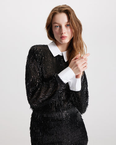 This sequin-embellished button-down takes cues from the tuxedo shirt, blending classic structure with allover shimmer. The relaxed silhouette allows for versatile styling. Wear it fully buttoned for a sleek, tailored look or layer it open over a tank for effortless, relaxed glamour. A standout piece that completes the full look when paired with the matching Kleio Sequin Skirt.